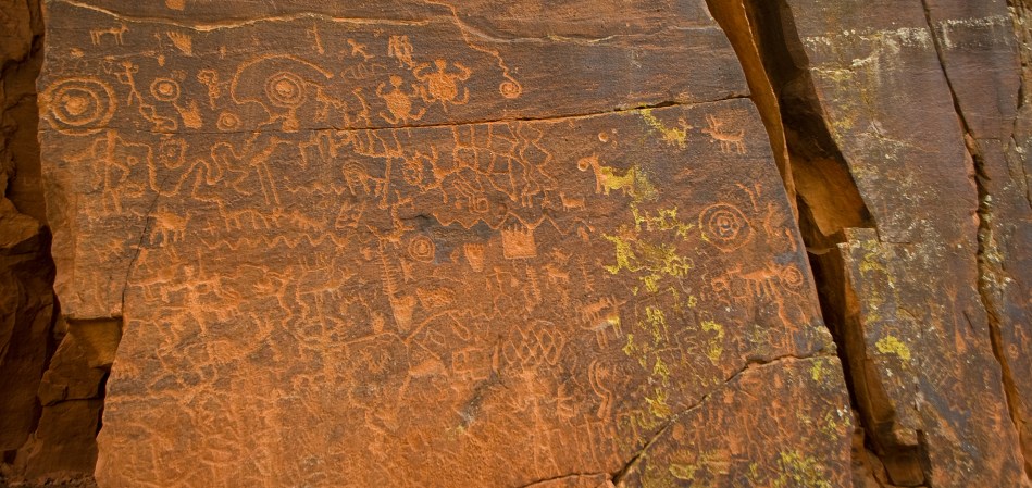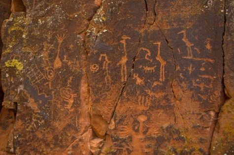 The main panel of petroglyphs at the V-V site. The sprial patterns at upper left are thought to have served as part of a solar calendar