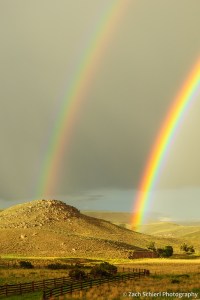 Double rainbow near Gunnison, Colorado. This rainbow appeared not long before sunset, when the Sun was low in the sky, thus nearly an entire semi-circle is visible.