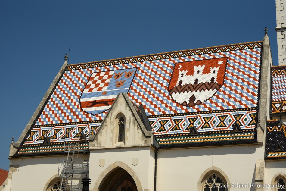 Our time in Zagreb was also limited, so the following morning we took a free walking tour to get our bearings. At the top of the town was St. Marks Church, with its unique roof covered in colorful tiles depicting the coat of arms of Croatia (left) and the city of Zagreb (right):