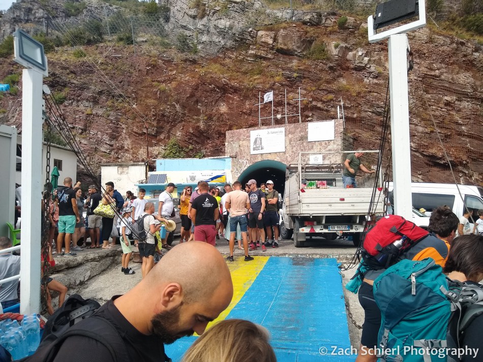 We departed at 6:30 am on a minibus, the primary mode of public transportation in Albania. The minibus drove around Shkoder for close to an hour picking up other people until the bus was full, then we headed out of town and quickly started climbing up into the mountains. Our destination was the Komani Lake ferry terminal. The Valbona Valley, while not far from Shkoder as the crow flies, is not easy to get to. One option is an all day drive that apparently involves crossing the border into Kosovo and then back into Albania. Option 2 involves a two-hour drive to Komani Lake, followed by a 3-hour ferry ride, and then another minibus for the final hour to Valbona. We opted for the latter and a few hours after departure from Shkoder arrived in the tiny and very rural town of Komani. From here, the road, which had been very rough dirt for the last hour, was suddenly paved and lined with a sidewalk and streetlights. The road climbed up a steep grade littered with rockfall before entering a small tunnel bored into the side of the mountain. About halfway through the tunnel, cars and buses were stopped in the road letting people out. Our bus somehow managed to squeeze past a bunch of them (if you had asked me whether this tunnel was wide enough for two mini buses to pass each other, I would have said “hell no”), but eventually had to stop as well. We got out of the bus, grabbed our stuff, and walked out through the end of the tunnel, which emerges at the base of a huge cliff next to a ~30×30 foot patch of pavement wedged between the cliff face and the shoreline of Lake Komani, which is actually a reservoir.