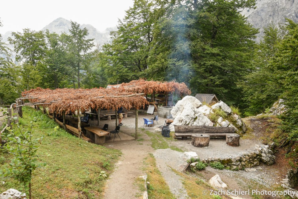 It was a cool, overcast, and humid morning as we walked the mostly flat, gravelly river bottom for the first few miles to the village of Rragram. After Rragram, the grade started to steepen. While it was still overcast and fairly cool, it was extremely humid and I’m not sure if I’ve ever sweat so much in my life. Times like these make me grateful that we live in the desert! Before too long we arrived at one of two small cafes found along the trail. This has to be the ultimate paradox of hiking off the beaten path in Europe: it’s almost impossible to find out how long the trail actually is, but you can still buy a cold beer every few miles. Quite surreal. This first cafe had a thatched roof of leaves, a wide selection of cold drinks cooled by a natural spring, and a plush bathroom with an ornate running water system. (Prices for those drinks were the highest that we had seen since London, which I guess makes sense. Generally speaking, prices in Albania were quite low. Dinner for two with drinks set us back the equivalent of about $20 most nights. A soda here at the cafe was $5.) We enjoyed two sodas even though it was not yet 9 am, to replace the many electrolytes we had lost via sweat in the last two hours.