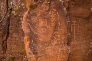 The main panel of petroglyphs at the V-V site. The sprial patterns at upper left are thought to have served as part of a solar calendar