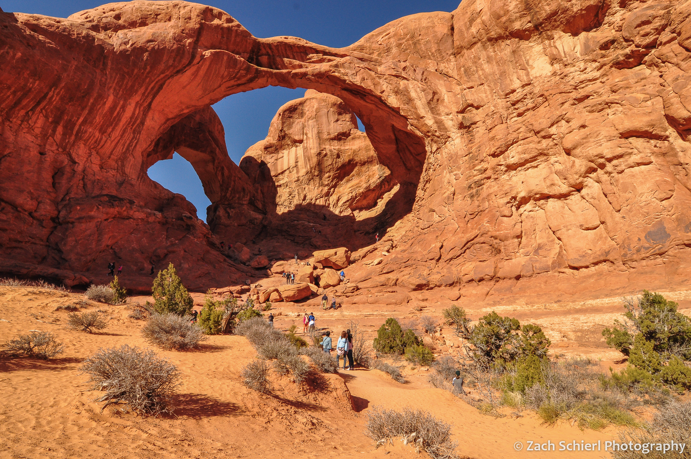 A line of hikers crawl up to Double Arch in the Windows section of Arches National Park, Utah