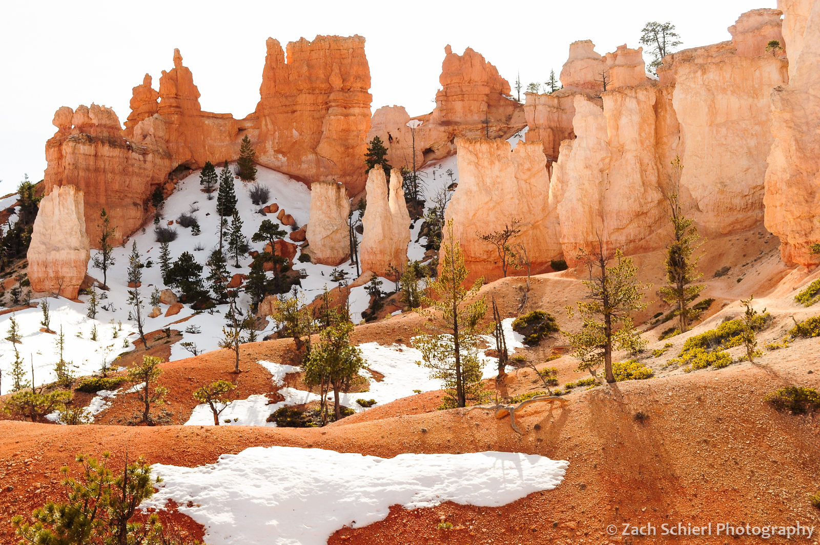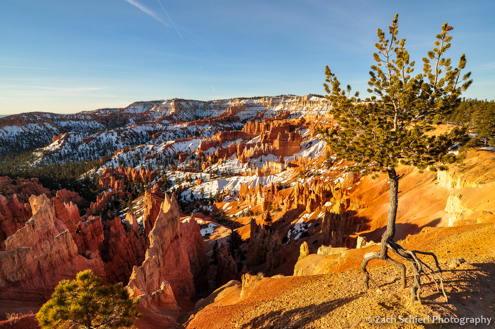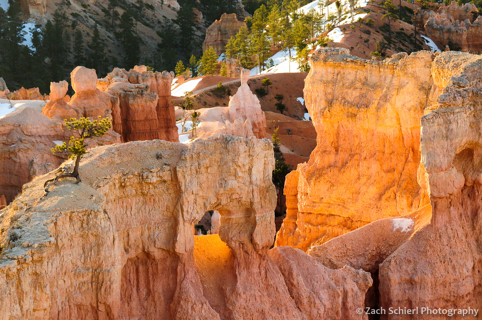 A scraggly Bristlecone Pine (Pinus longaeva) between residual snow patches along the trail to Tower Bridge, Bryce Canyon National Park, Utah