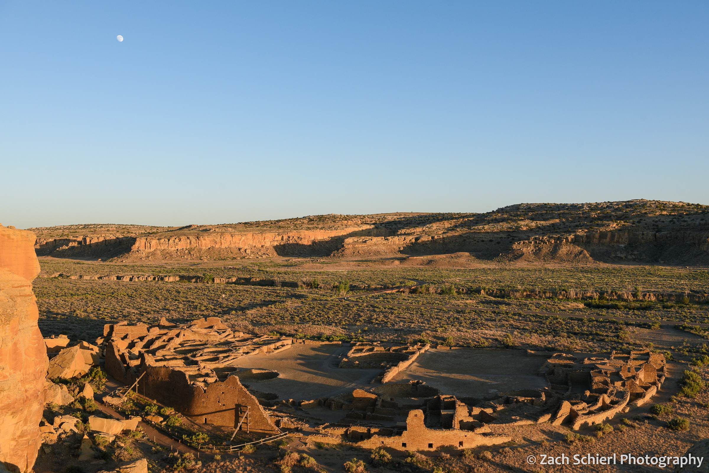 Sunset with a gibbous moon at Chaco Canyon, New Mexico