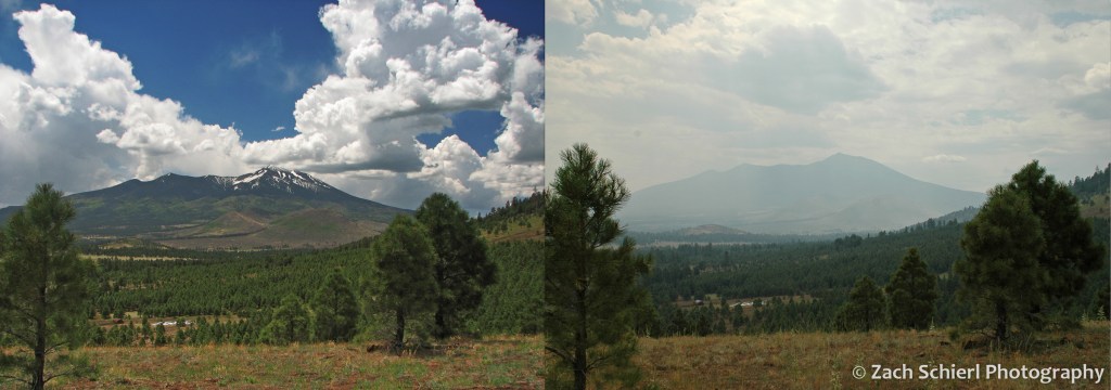 San Francisco Peaks on a clear day (left) and seen through wildfire smoke (right)