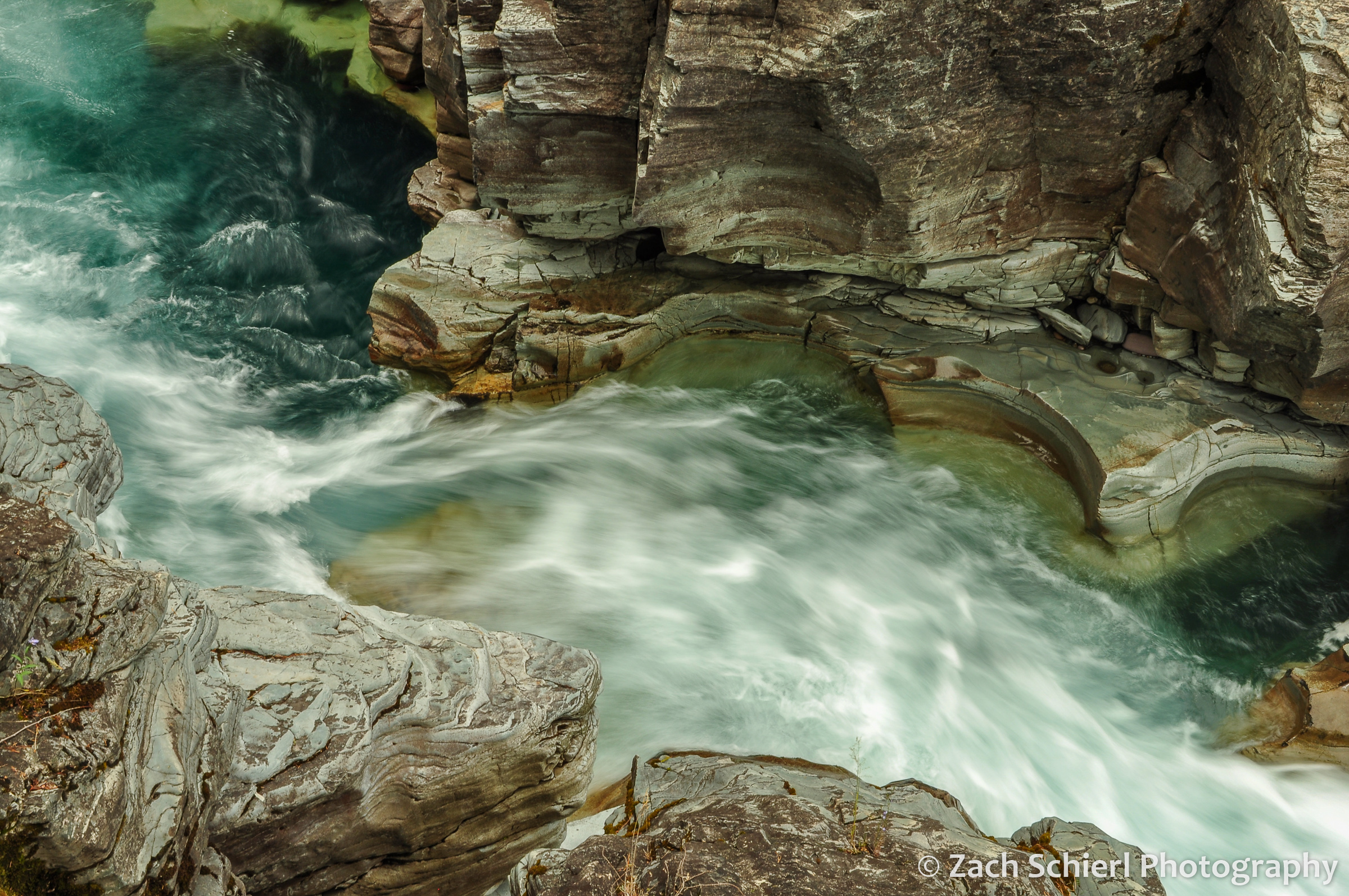 Cliffs of dark gray limestone belonging to the Helena Formation tower above Upper Grinnell Lake.