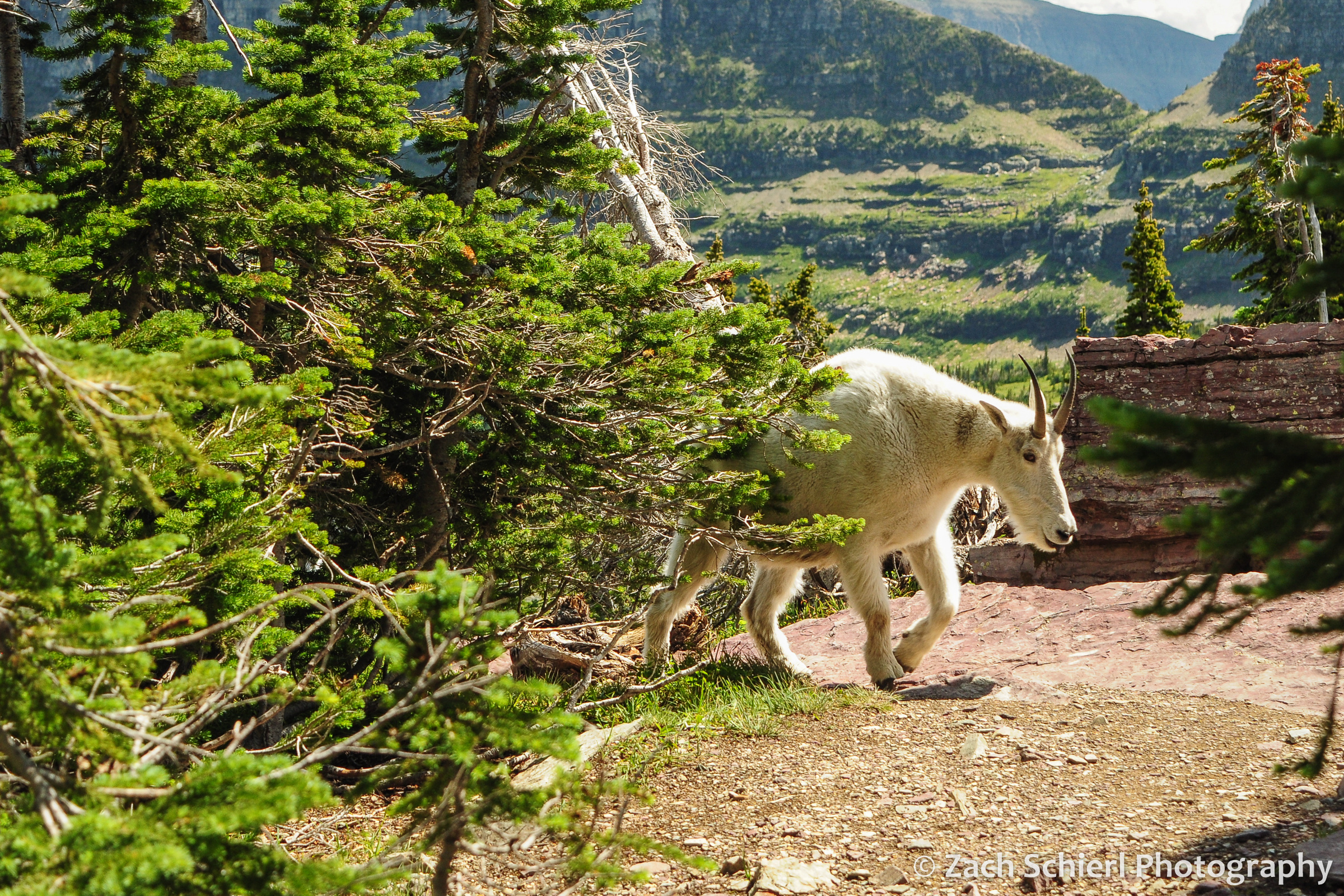 A bighorn sheep (Ovis canadensis) alongside the trail, with Grinnell Glacier in the background.