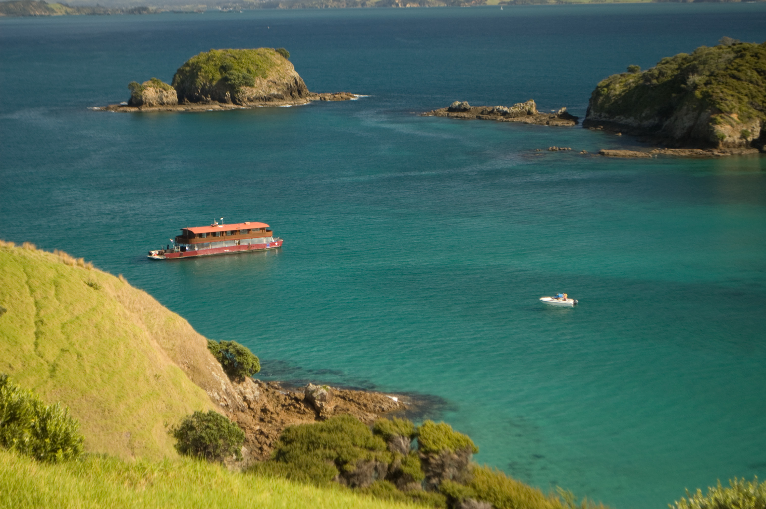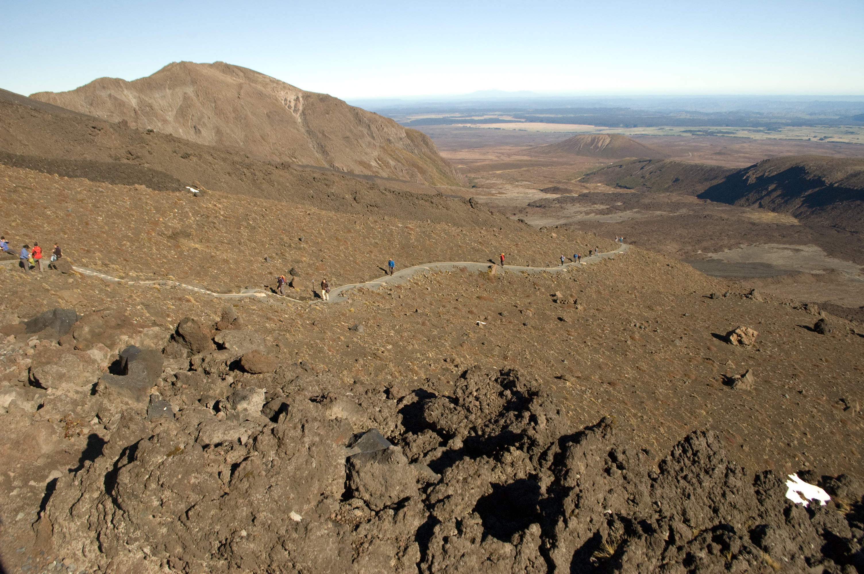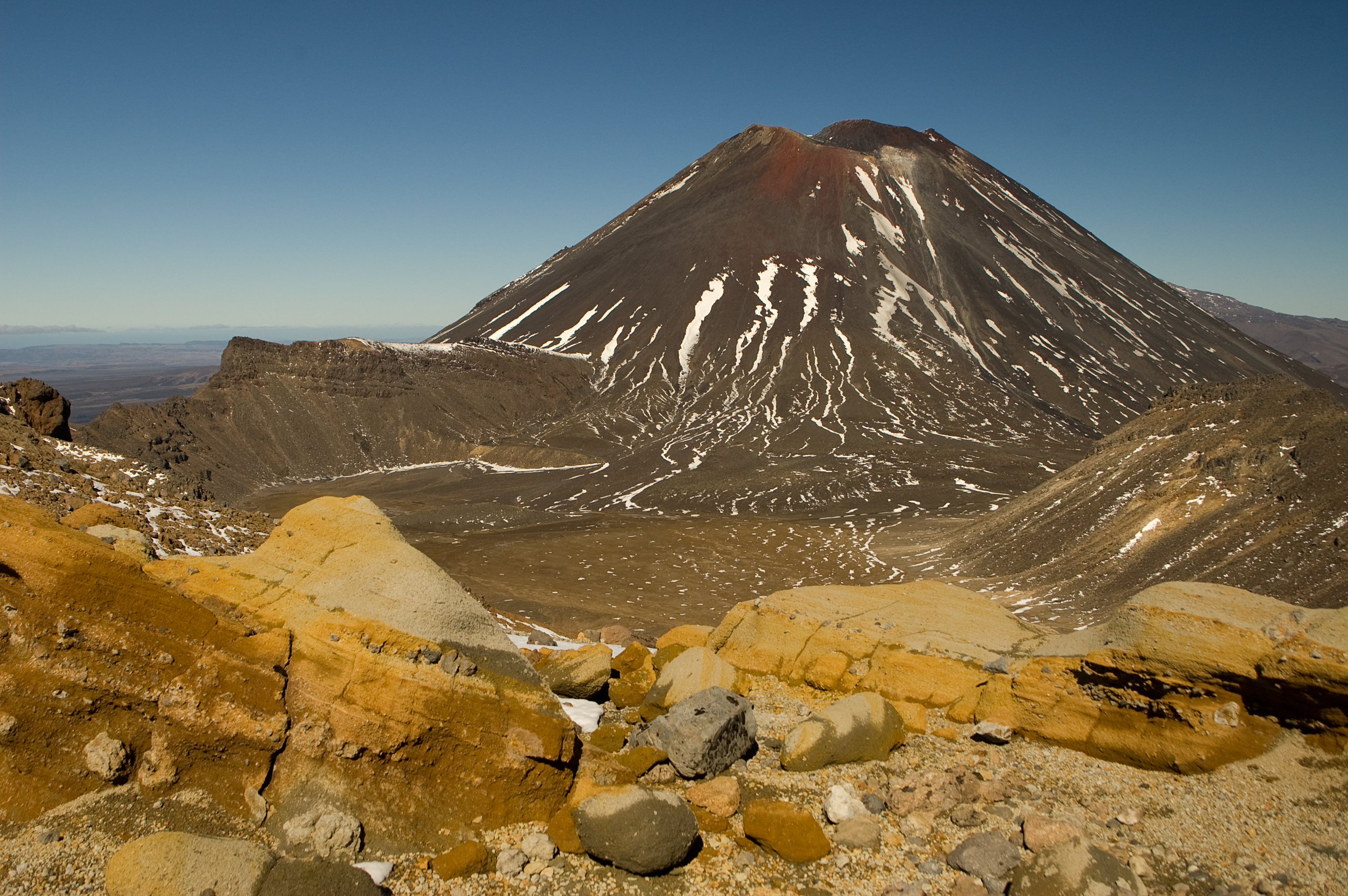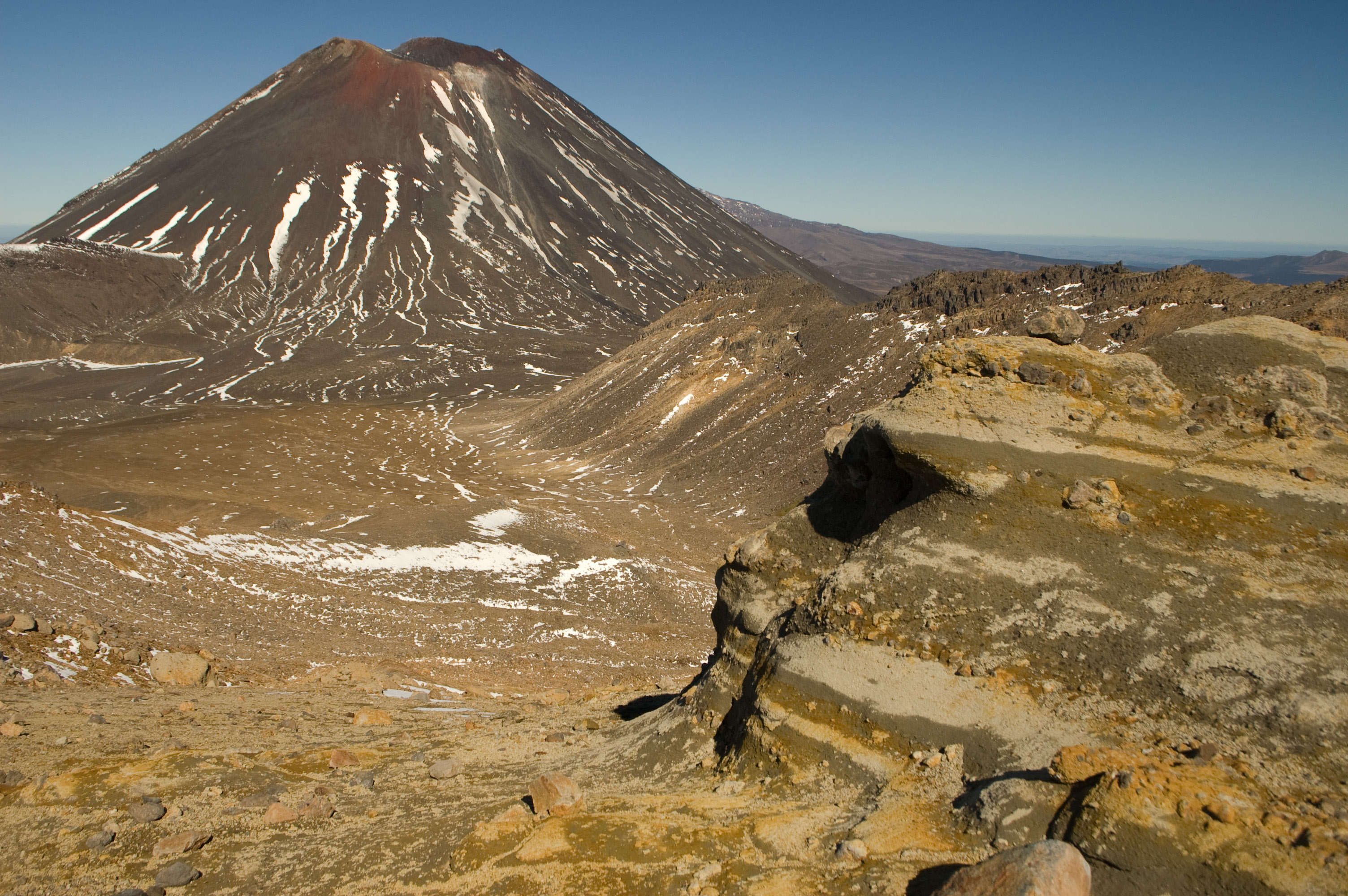 Layered, hydrothermally altered volcanic deposits dot the foreground, Mt. Ngarahoe visible in the background from Mt. Tongariro