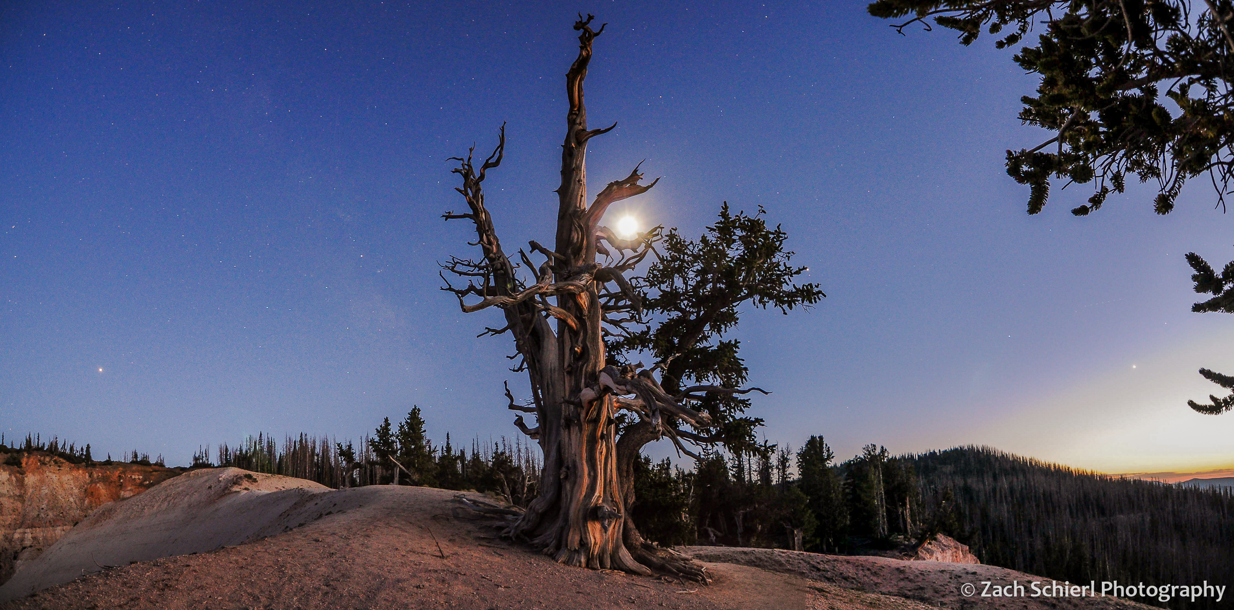 The Moon and a string of planets over an ancient bristlecone pine (Pinus longaeva) at Cedar Breaks National Monument, Utah