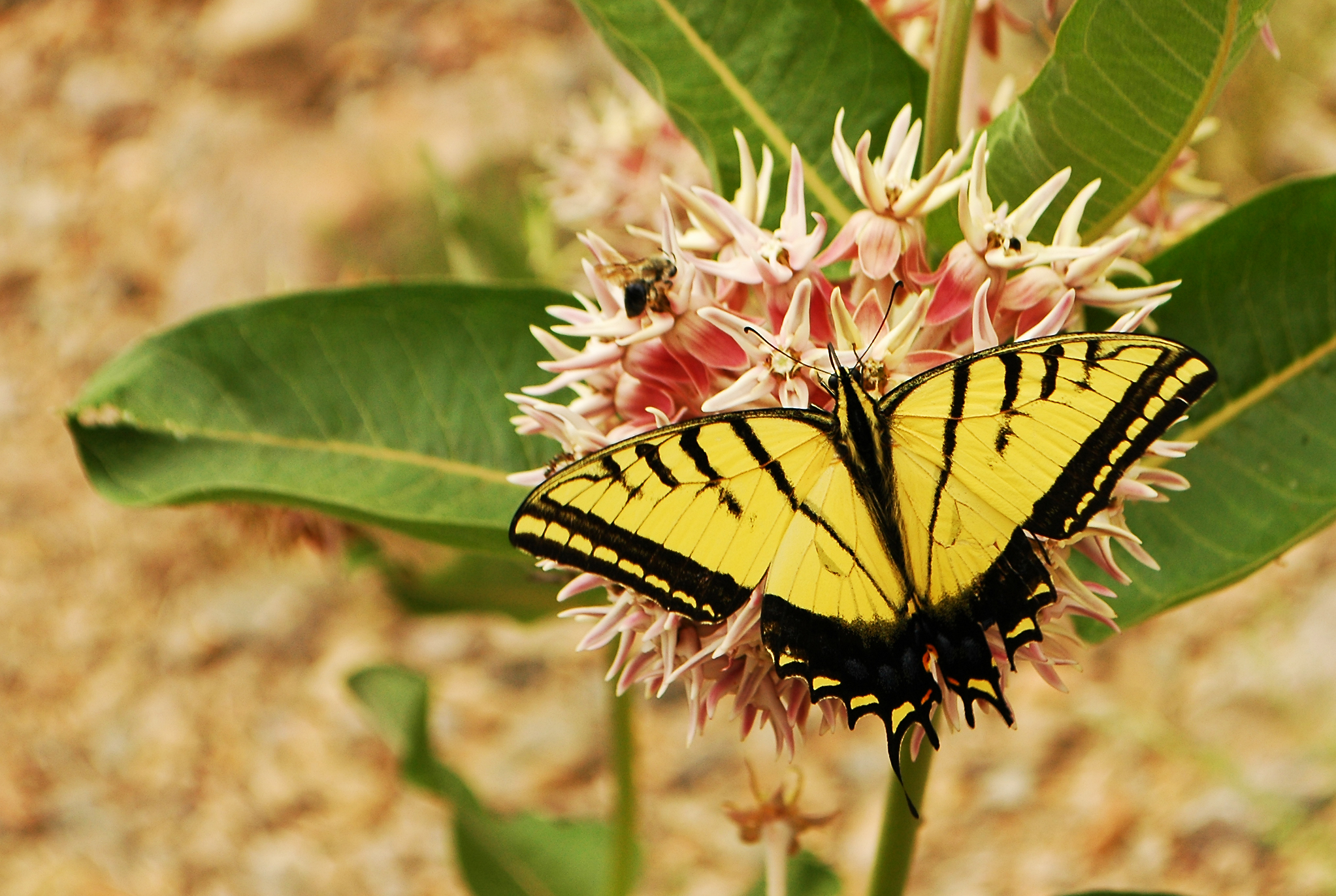 A Western Tiger Swallowtail (Papilio rutulus) feeds from a crimson columbine (Aquilegia formosa) along Baker Creek, Great Basin National Park, Nevada