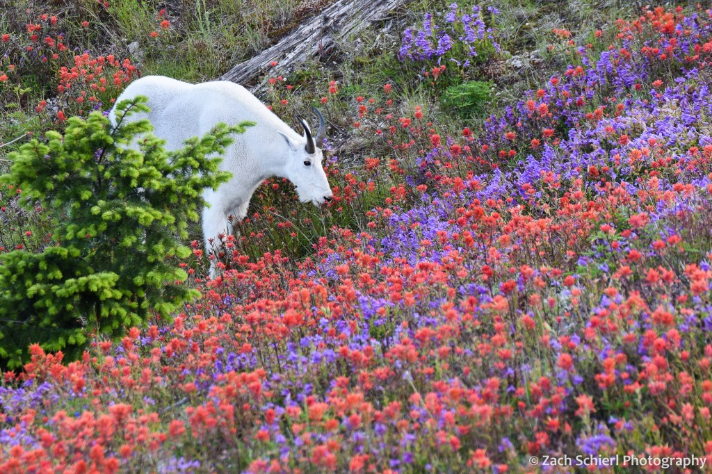 Mountain goat and wildflowers, Mt. St. Helens National Volcanic Monument, Washington