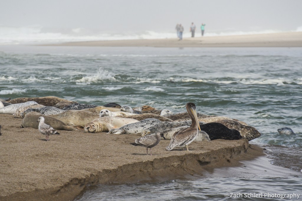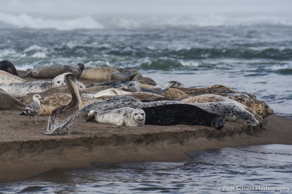 Brown pelican (Pelecanus occidentalis) and Pacific harbor seals (Phoca vitulina) on Salishan Spit near Lincoln City, Oregon