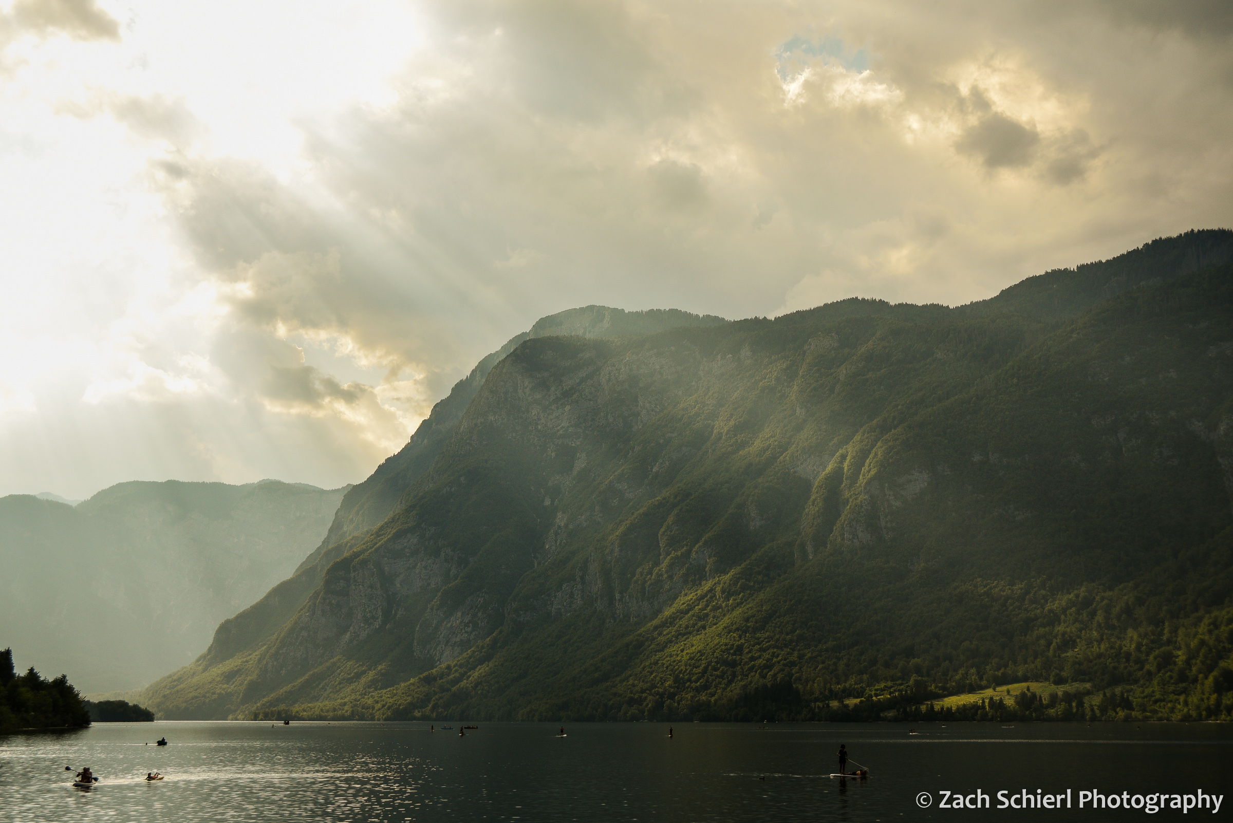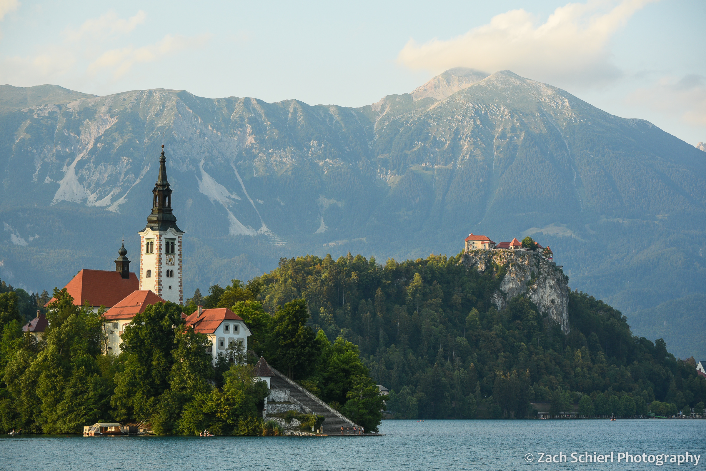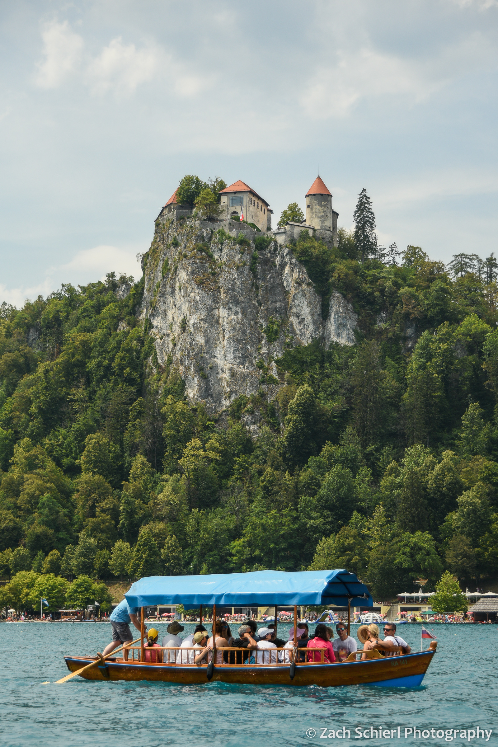 A traditional pletna boat whisks visitors across Lake Bled in the shadow of the Bled Castle