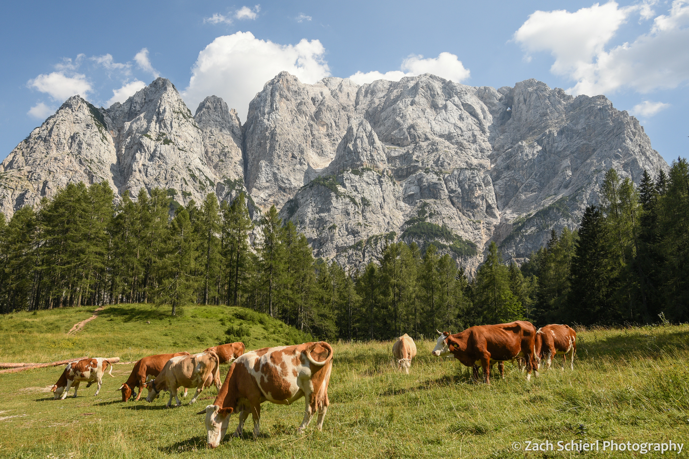 Cows and mountain peaks along the Vrsic Pass Road, Slovenia