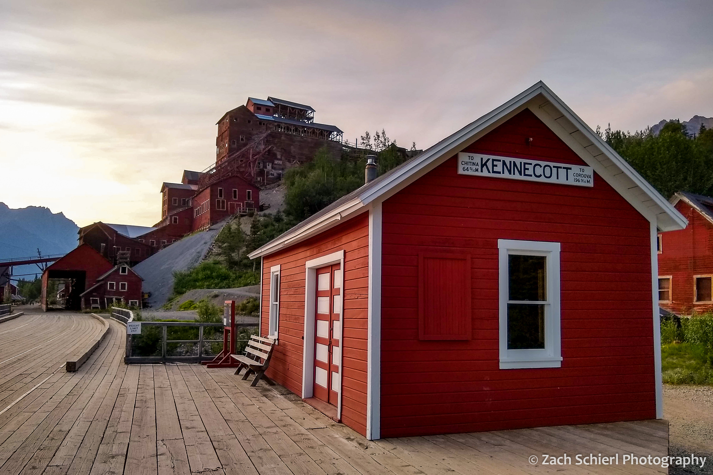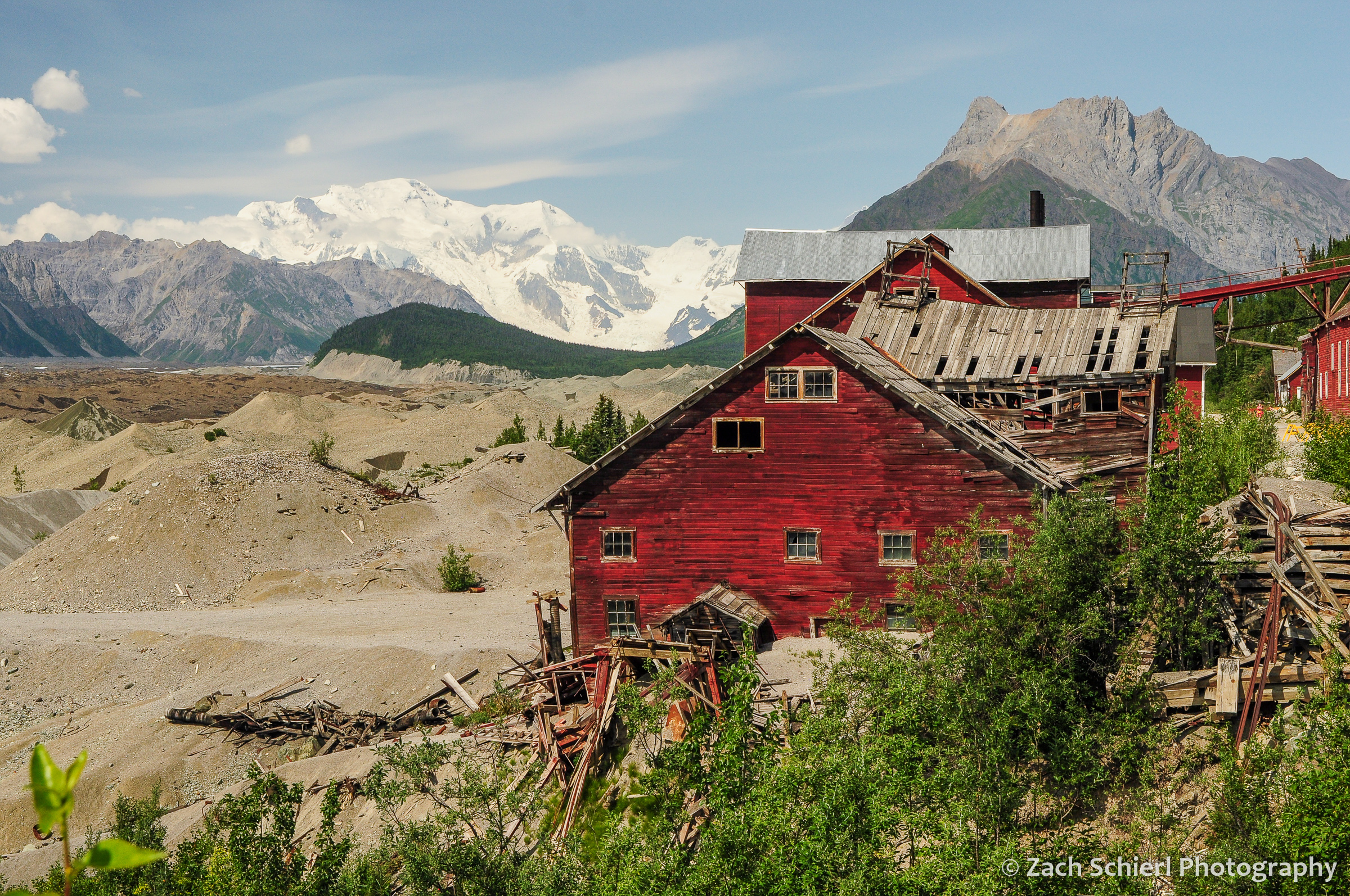 Old mining buildings in Kennecott cling to the slopes above the debris-covered Kennicott Glacier, which originates on the slopes of Mt. Blackburn, seen in the background.