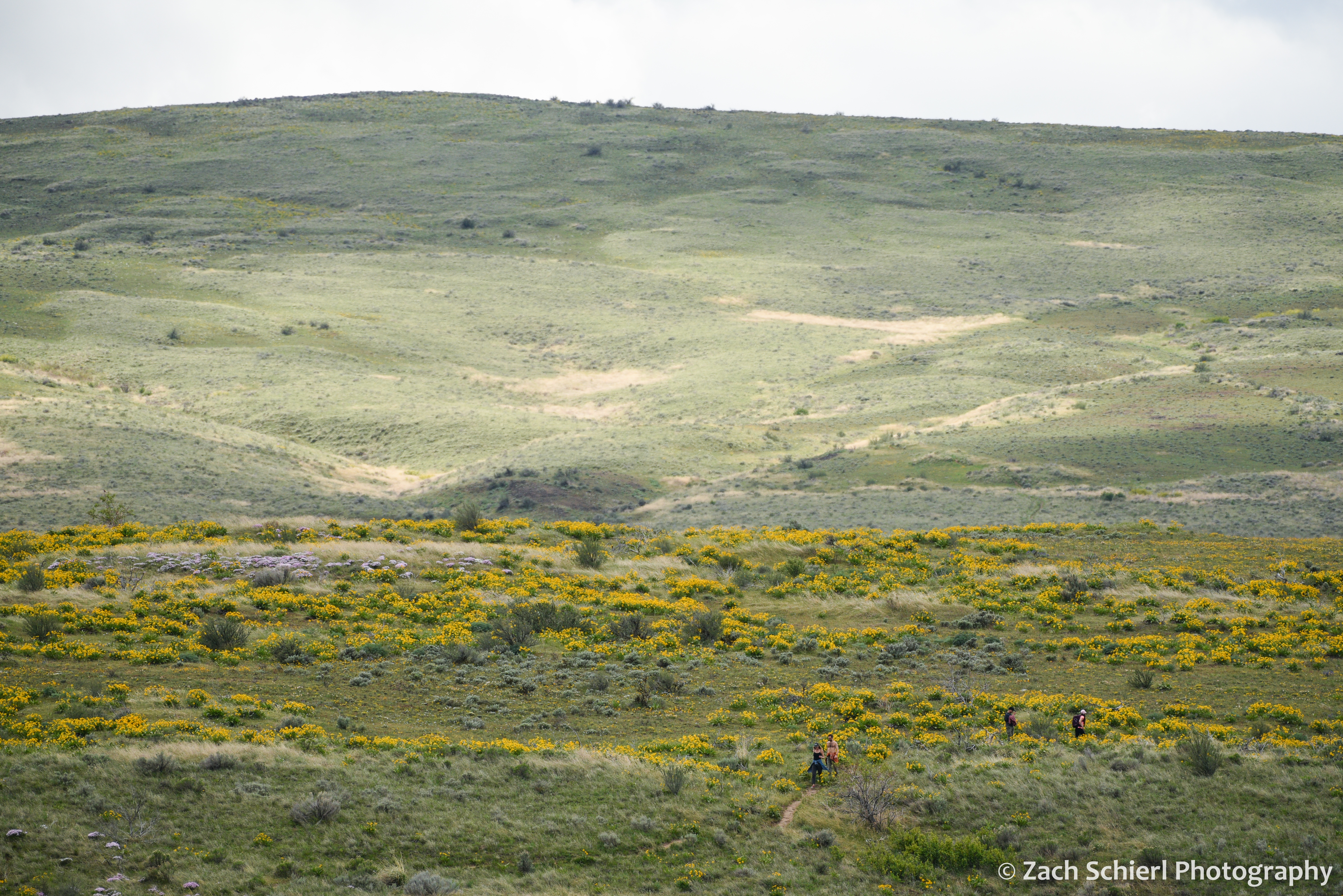 Hikers traverse slopes covered in arrowleaf balsamroot (Balsamorhiza sagittata), Snow Mountain Ranch, Yakima, WA