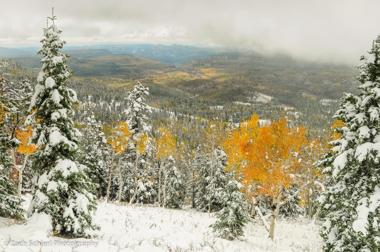Colorful aspens among snow-covered firs on the south slopes of the Markagunt Plateau, looking south toward Kolob Terrace and Zion National Park.