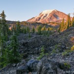 We had shared the trail with quite a few other hikers and backpackers on Day 1, but saw only a few other people from this point forward. Camp on night two was in a small clump of trees on the edge of a relatively recent lava flow. In contrast to the verdant alpine meadows of night one, this landscape was much more rugged, barren, and stark. After setting up our tent, we proceeded up the trail (with much lighter packs!) to find a spot for dinner. We quickly arrived at a stream crossing that we didn’t feel comfortable fording, so we left the trail behind and proceeded to pick our way up the rubbly bank until we arrived at a small knob with a spectacular view of the glaciers on Mt. Adams’ northeast face (Lava, Lyman, and Wilson). Here we enjoyed a delicious meal of instant mashed potatoes mixed with green chiles and an entire bag of bacon bits while listening to the roar of the creek.