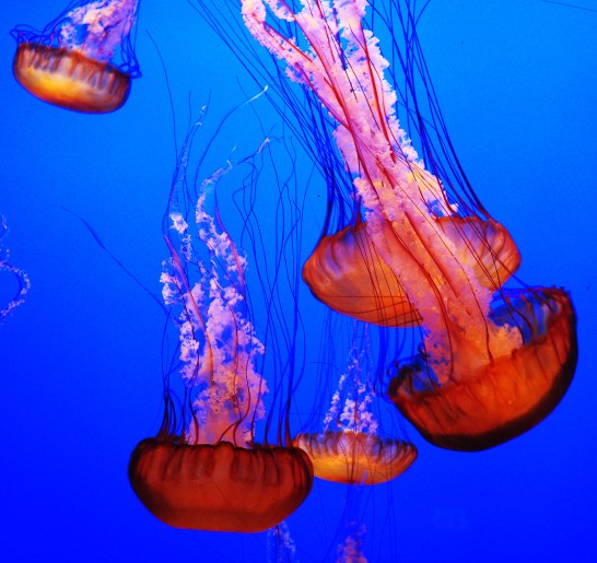 A bloom (or swarm…experts seem to disagree on the proper term for a group of jellyfish) of aquarium-bound jellyfish. We saw a whole bunch of these floating in the ocean from a pier in Monterey which sort of made me never want to go in the ocean again.