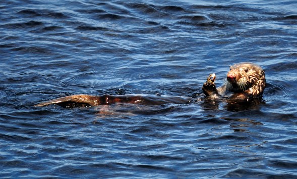 Sea otter in Monterey Bay willing to work for his/her afternoon snack. We watched this otter floating on his back cracking open various sea critters for a good twenty minutes.